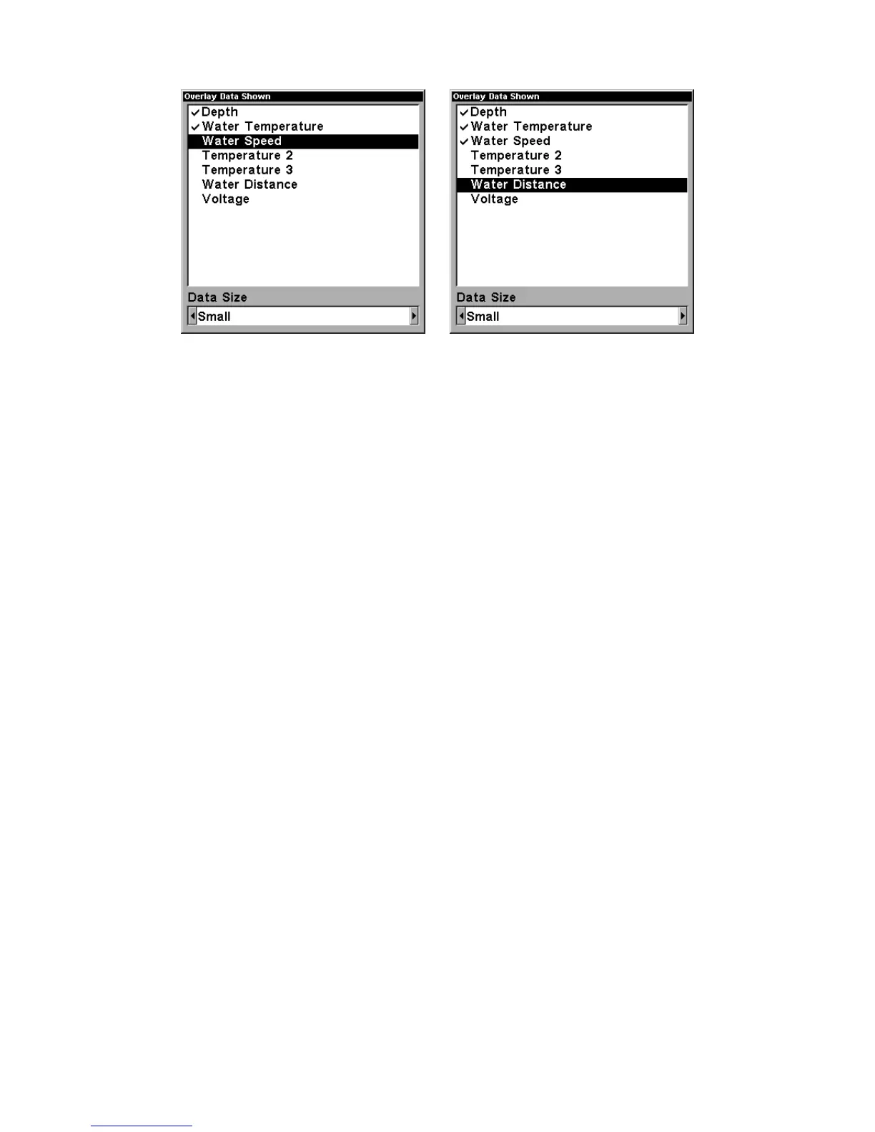 right, data list showing "Water Speed" selected to display on Sonar Page.