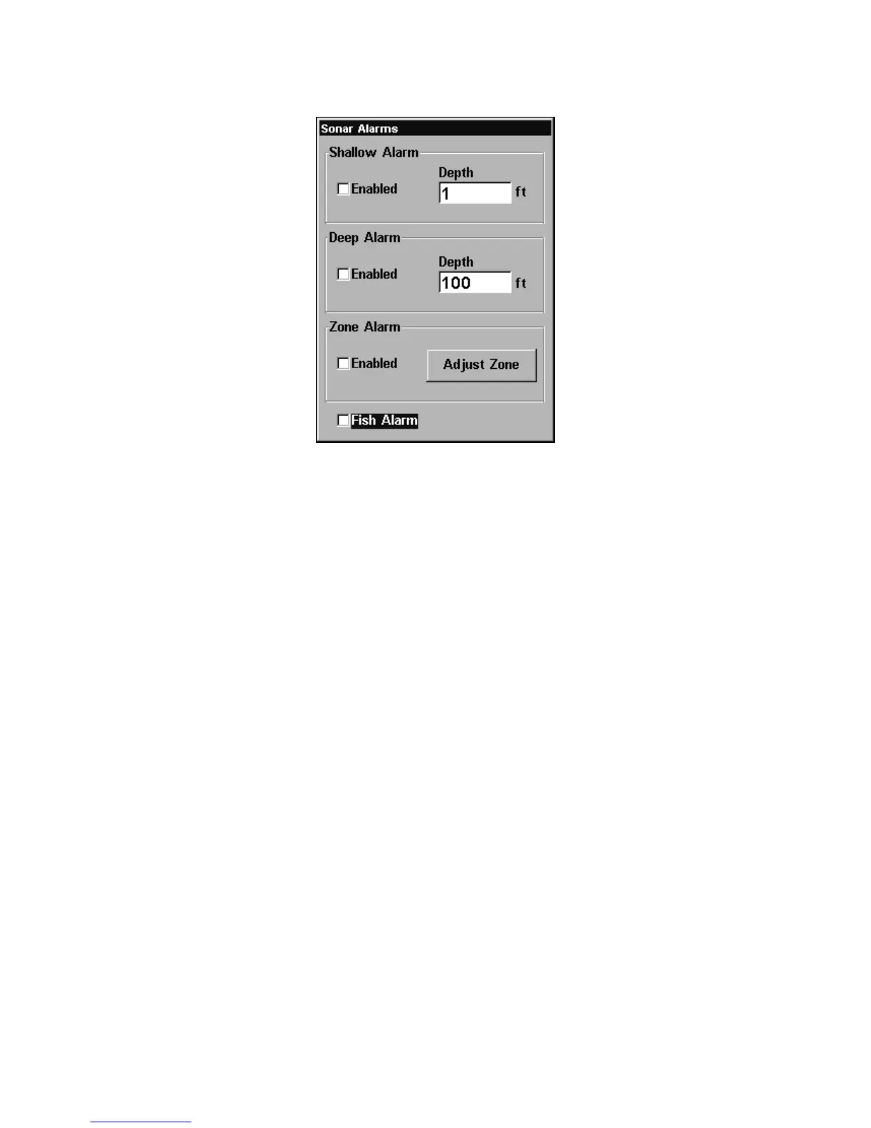 Sonar Alarms menu with Fish Alarm selected. The check box to the left