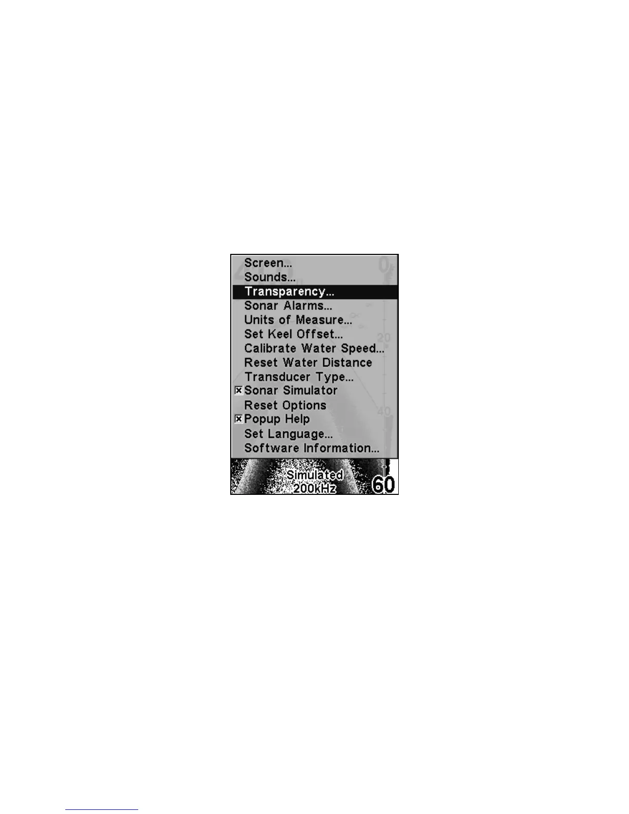 MENU|MENU|↓ to TRANSPARENCY|ENT. The TRANSPARENCY slider bar