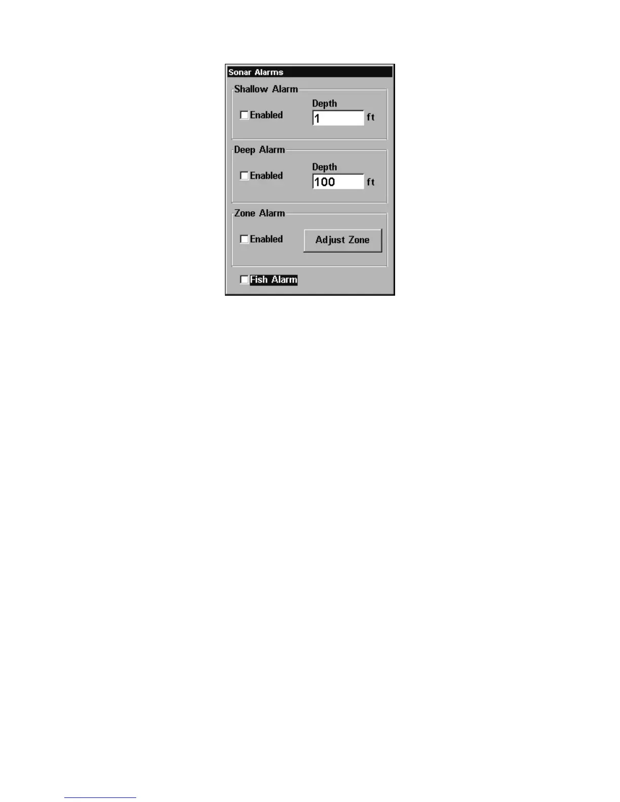 Sonar Alarms menu with Fish Alarm selected. The check box to the left