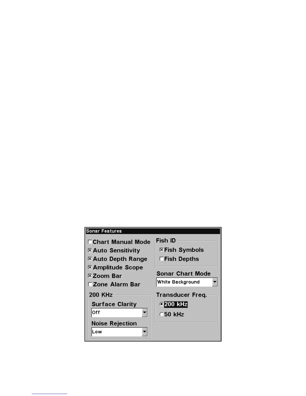 Sonar Features menu with a frequency of 200 kHz selected.