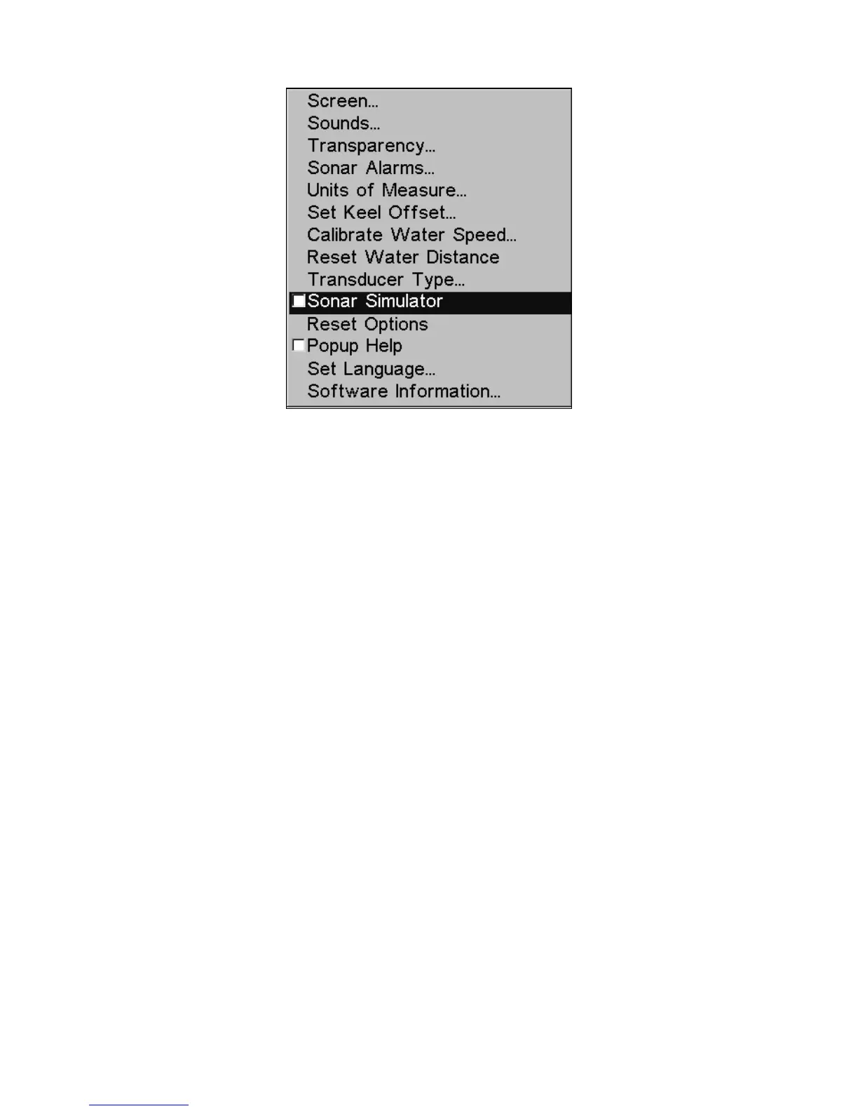 Main Menu with Sonar Simulator command selected.