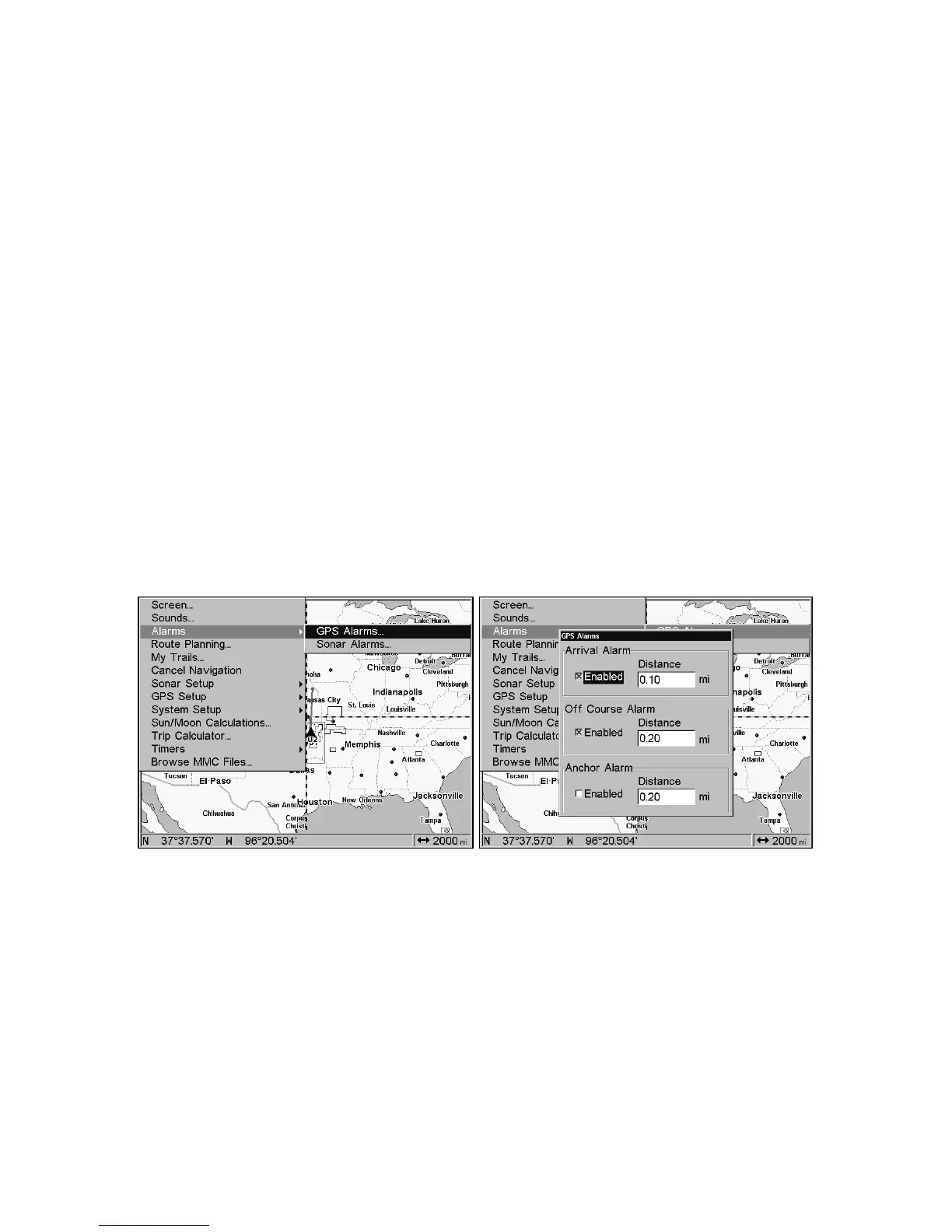 GPS Alarms highlighted (left); GPS Alarms menu (right).