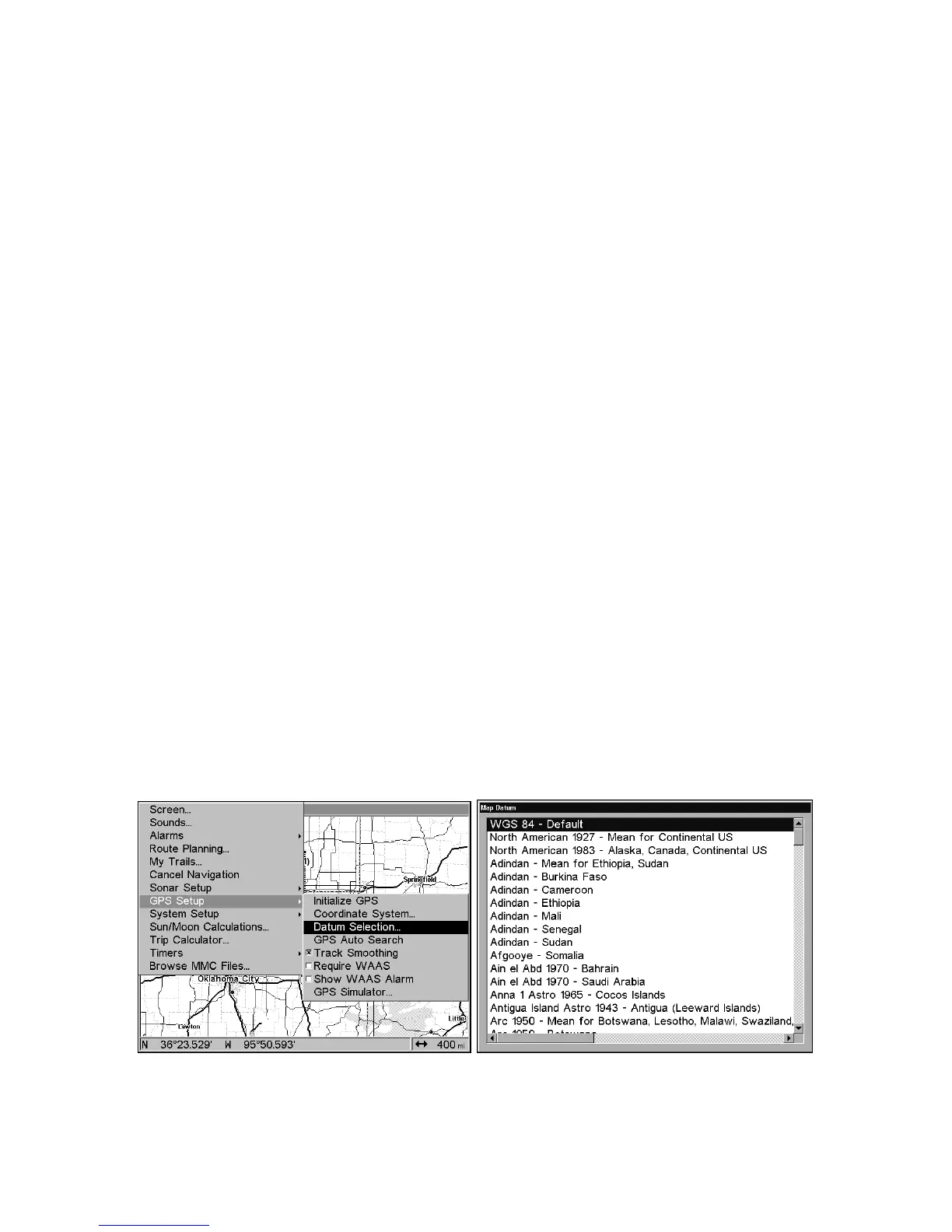 GPS Setup Menu (left); Map Datum Menu (right).