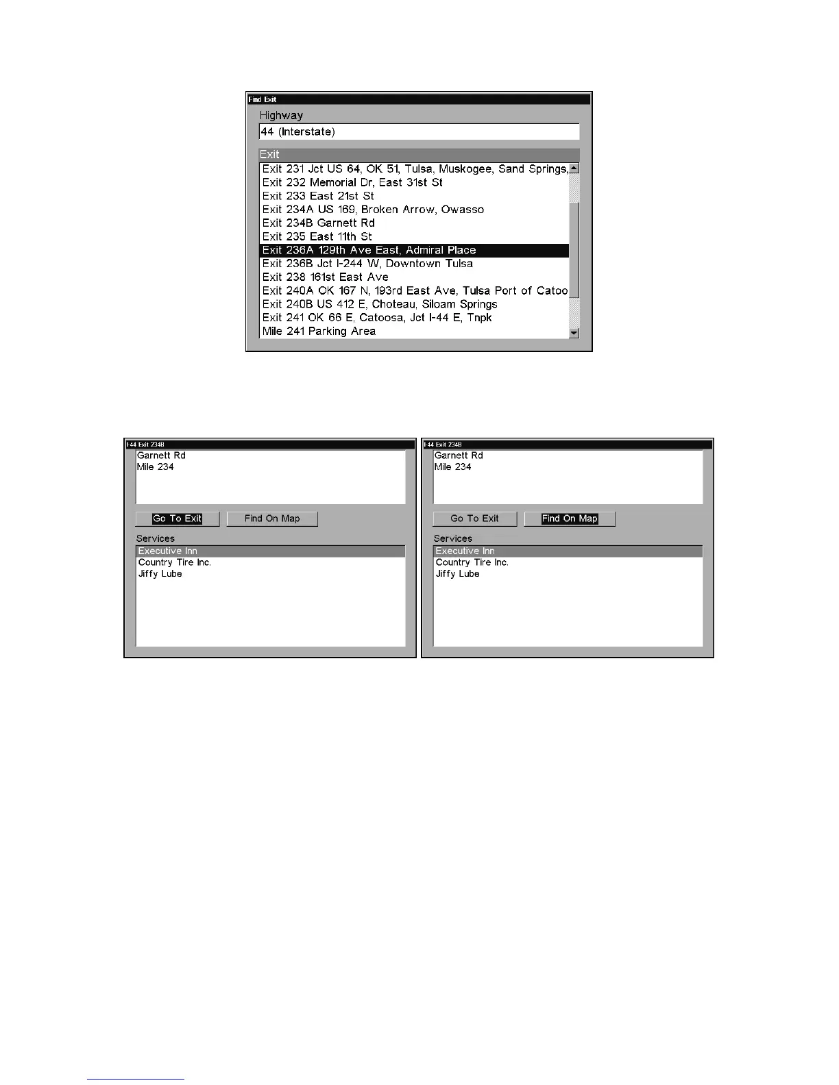 Go To Exit option (left); Find On Map option (right).