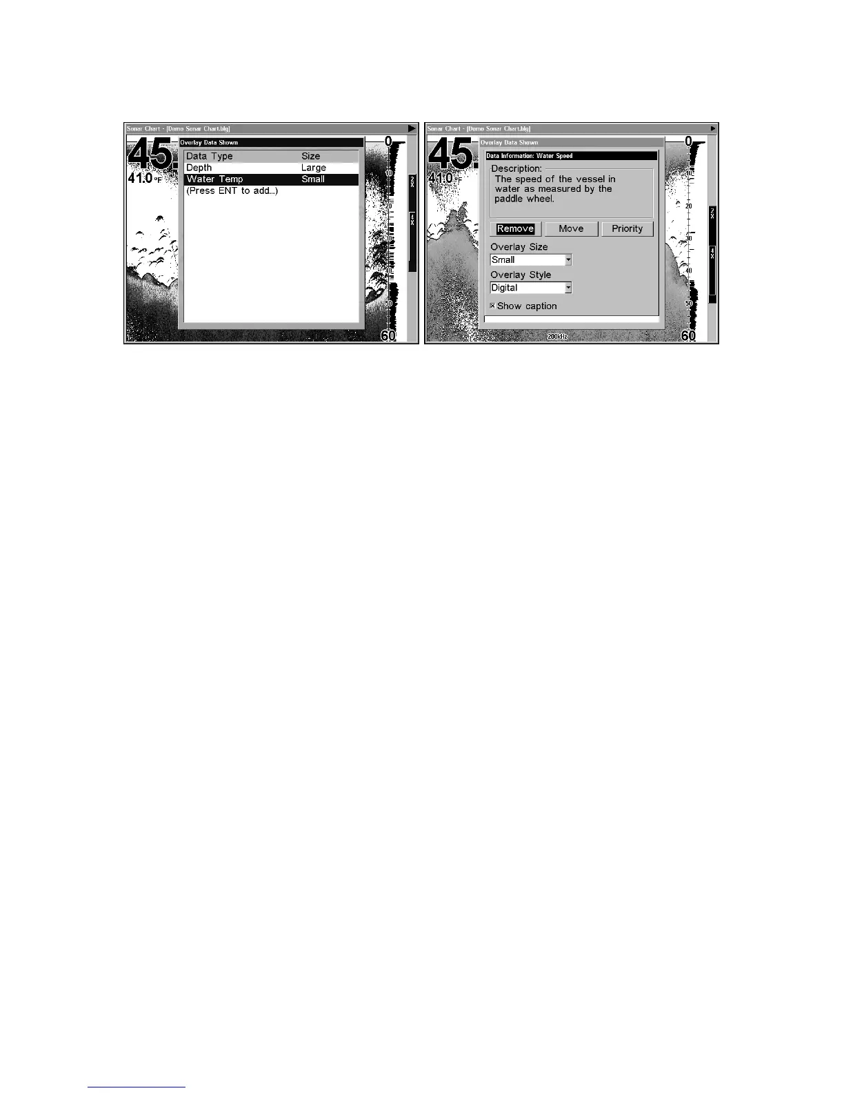 Overlay Data Shown with water speed selected (left). Press ENT to