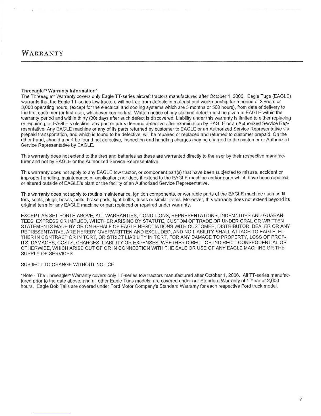 The Threeagle'" Warranty covers only Eagle TT-series aircraft tractors manufactured after October