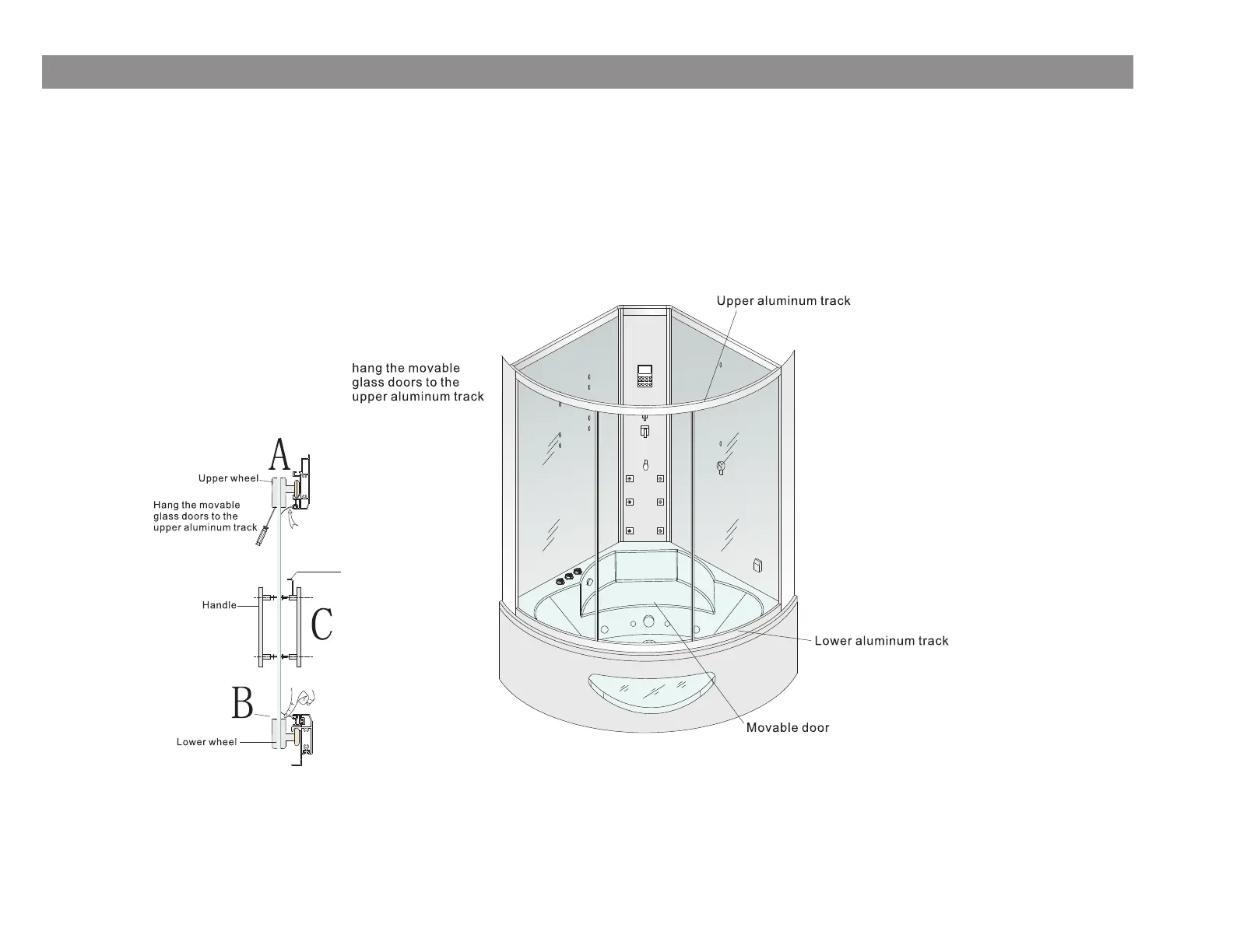 1. Hang the doors on the upper track (Illustrated in Drawing A) Then press the lower spring loaded wheels down to hook into the lower aluminum track.