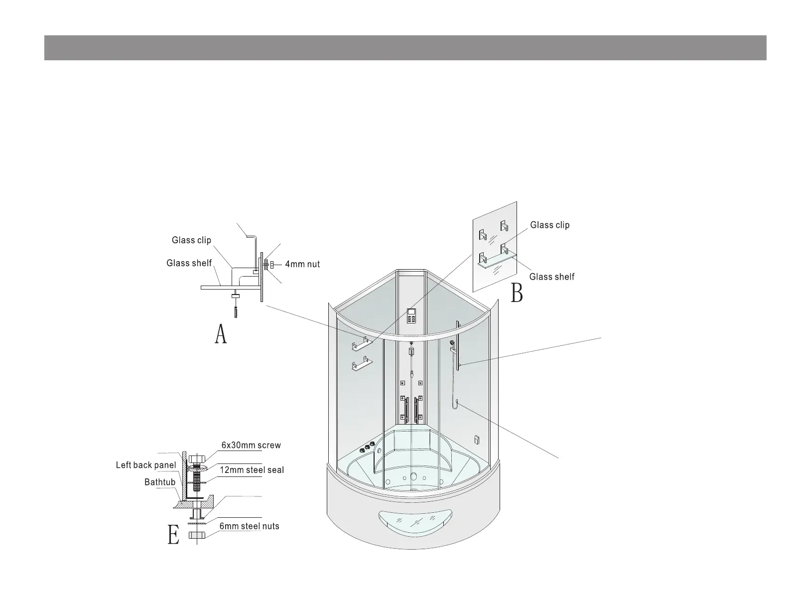 4. Fix back panels to the shower base with 6x30mm screws, 6mm lock washers, 12mm stainless steel washer and bracket as Illustrated in Drawing E.
