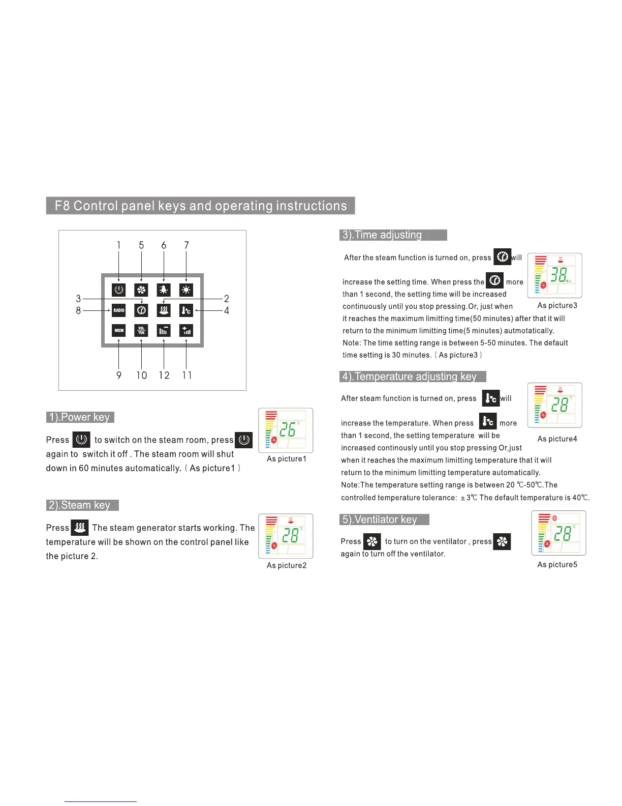 EAGO DZ960F8 - EAGO Shower F8 Control Panel Operations; EAGO Shower Control Panel: Power & Steam; EAGO Shower Control Panel: Time & Temp Adjust; EAGO Shower Control Panel: Ventilator