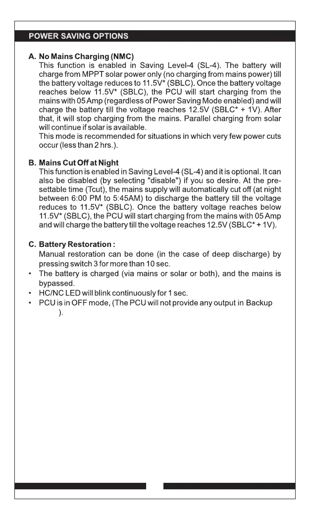 EAPRO TRON 1050VA - Power Saving Options; No Mains Charging (NMC) Function; Mains Cut Off at Night Function; Battery Restoration Procedure