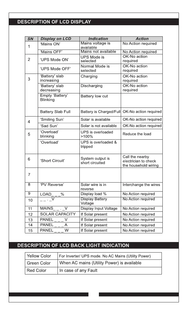 EAPRO TRON 1050VA - LCD Display Descriptions; LCD Display Status Interpretations; LCD Backlight Color Meanings