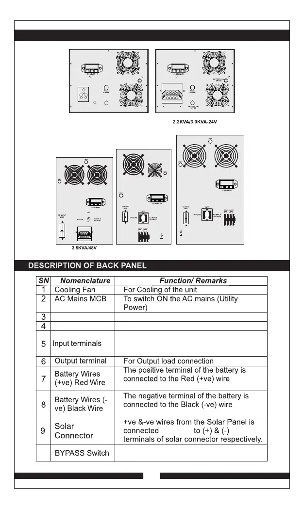 BACK PANEL OF THE MPPT OFF GRID HYBRID SOLAR PCU
