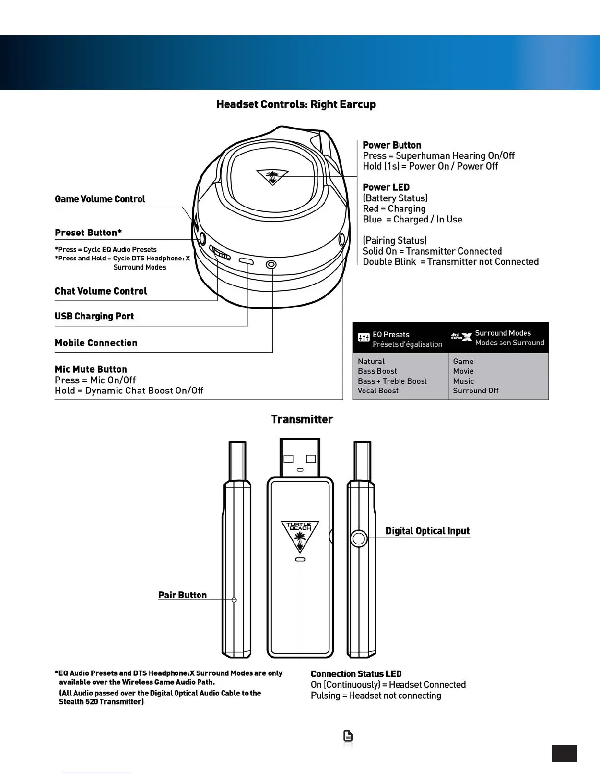 Ear Force STEALTH 520 - Parts and Controls; Headset Controls: Right Earcup; Transmitter Controls