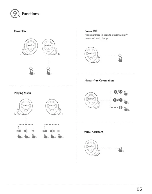 EarFun Free - Functions; Power Management; Music and Call Controls; Voice Assistant Activation