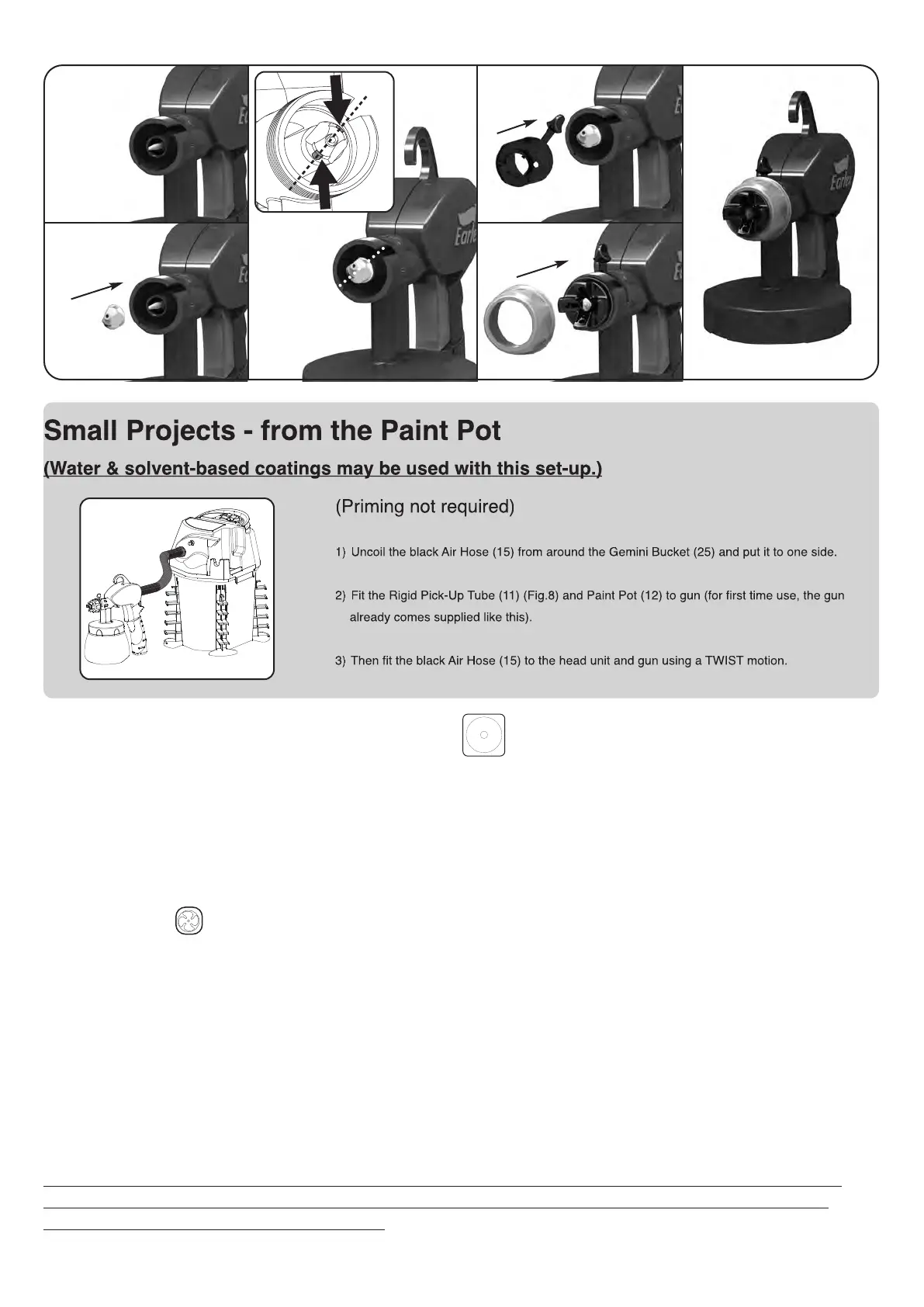 2. Push the Rigid Pick-Up Tube (11) firmly into the base of the spray gun body. Screw the Paint Pot (12) onto the spray gun body tightly.