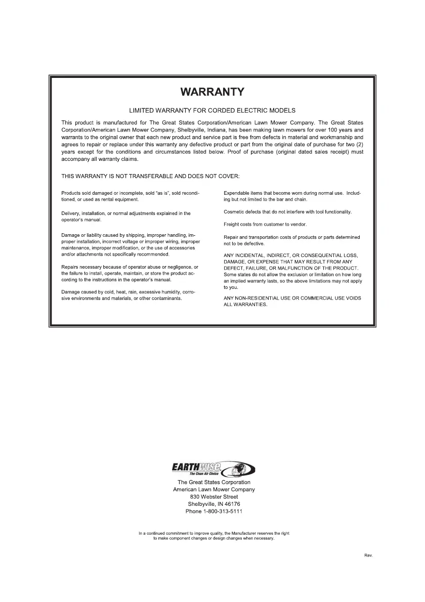 EarthWise CS30116 - Limited Warranty Information; Warranty Terms and Exclusions