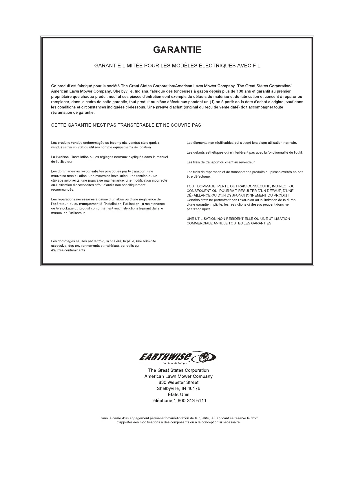 Cette garantie n'est pas transférable et s'applique seulement au produit vendu