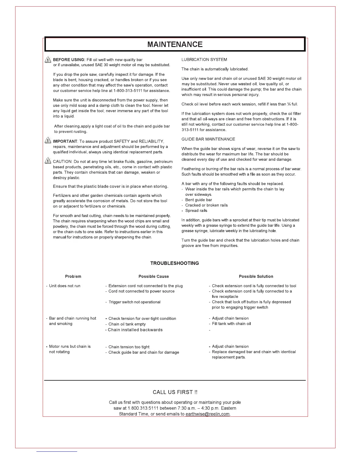 EarthWise CVPS41008 - Maintenance and Troubleshooting; Pre-Use Checks and Cleaning; Guide Bar Care and Troubleshooting
