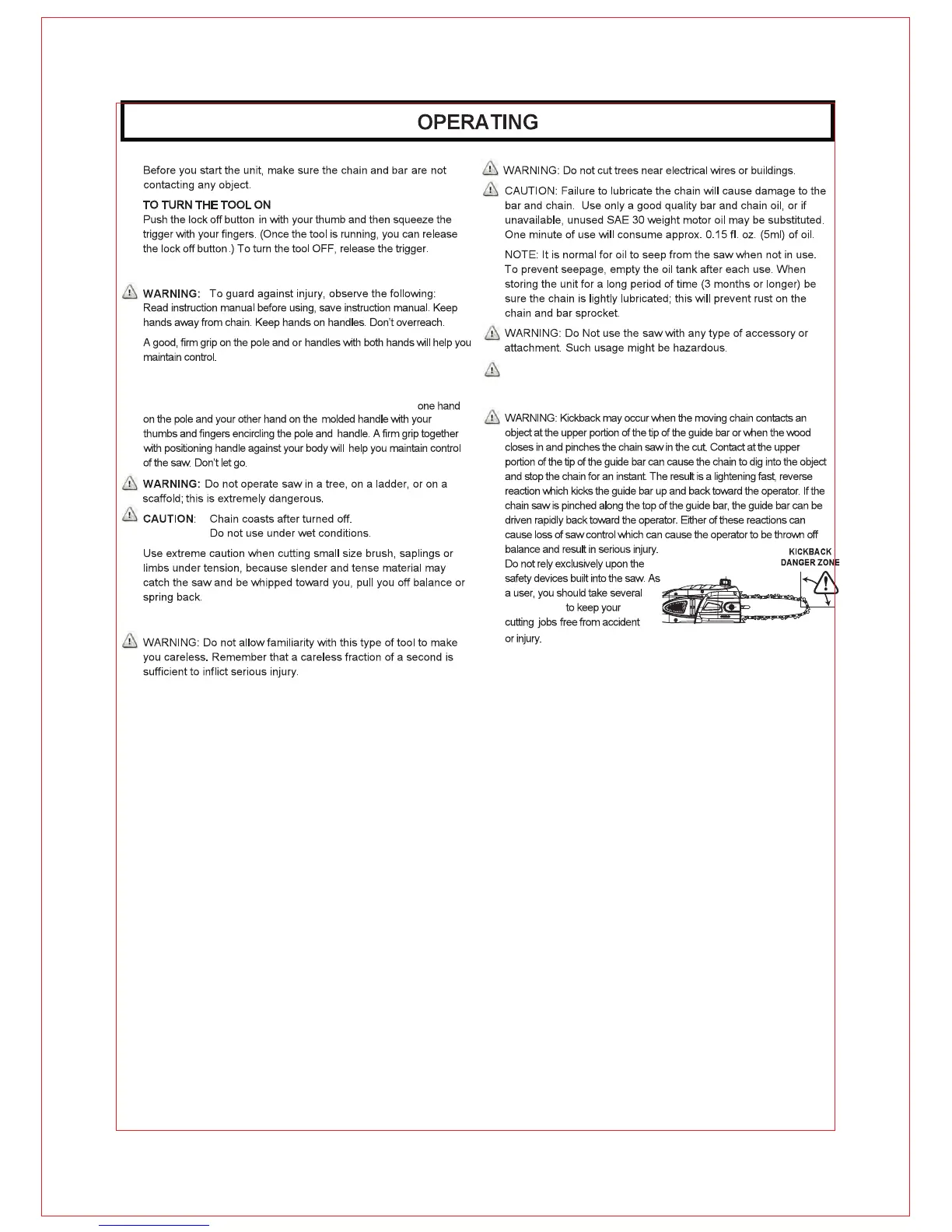Do not use saw to cut vines and/or small underbrush.