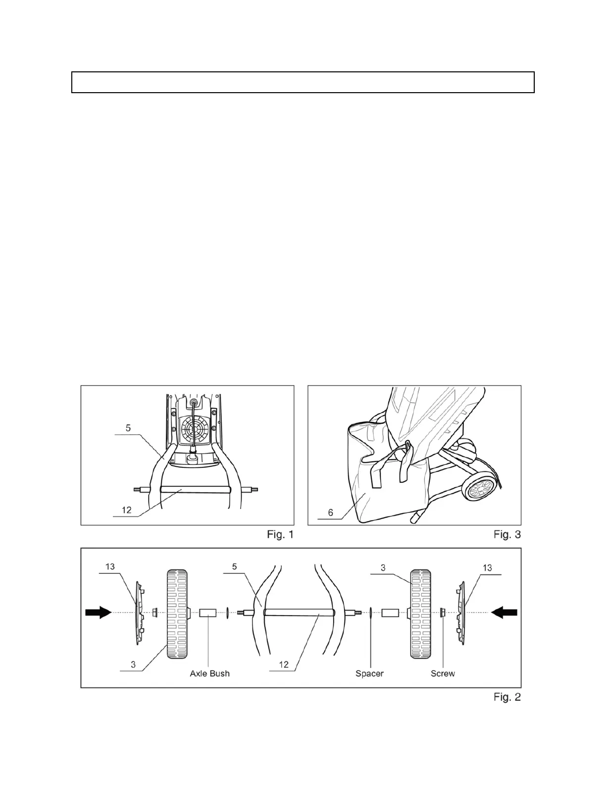 4. Place the spacer and axle bush on both end side of the wheel axle (12), attach the wheels (3)