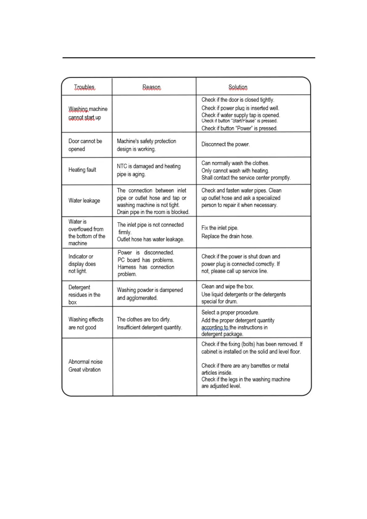 EAS Electric EMW580E2 - 6. TROUBLESHOOTING; Start-up, Door, Heating, and Leakage Issues; Display, Detergent, and Washing Effect Problems; Addressing Noise and Vibration