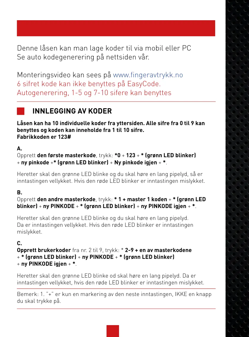 blinker) + ny PINKODE + * (grønn LED blinker) + ny PINKODE igjen + *.