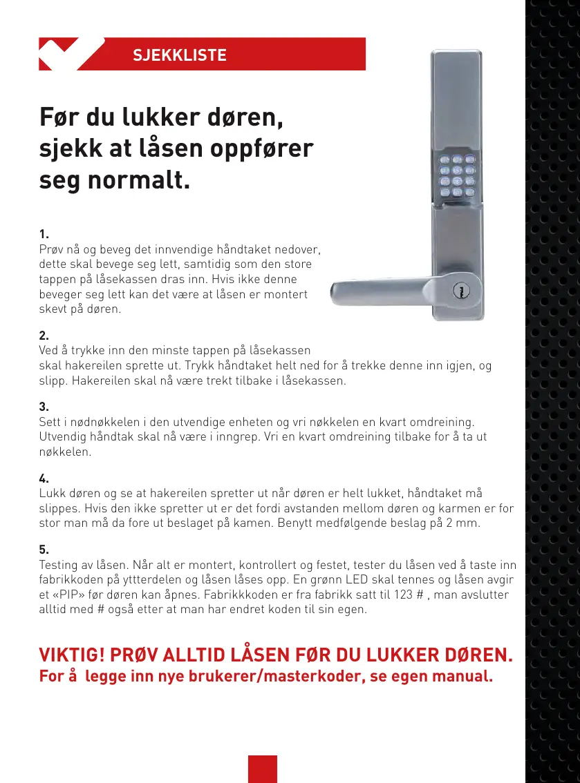 VIKTIG! PRØV ALLTID LÅSEN FØR DU LUKKER DØREN.