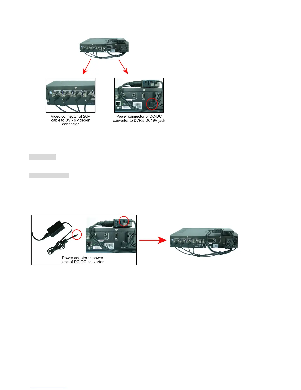 Step 2: Connect the video connector with the BNC jack of the 20M cable to the video-in connector of the DVR. Then,