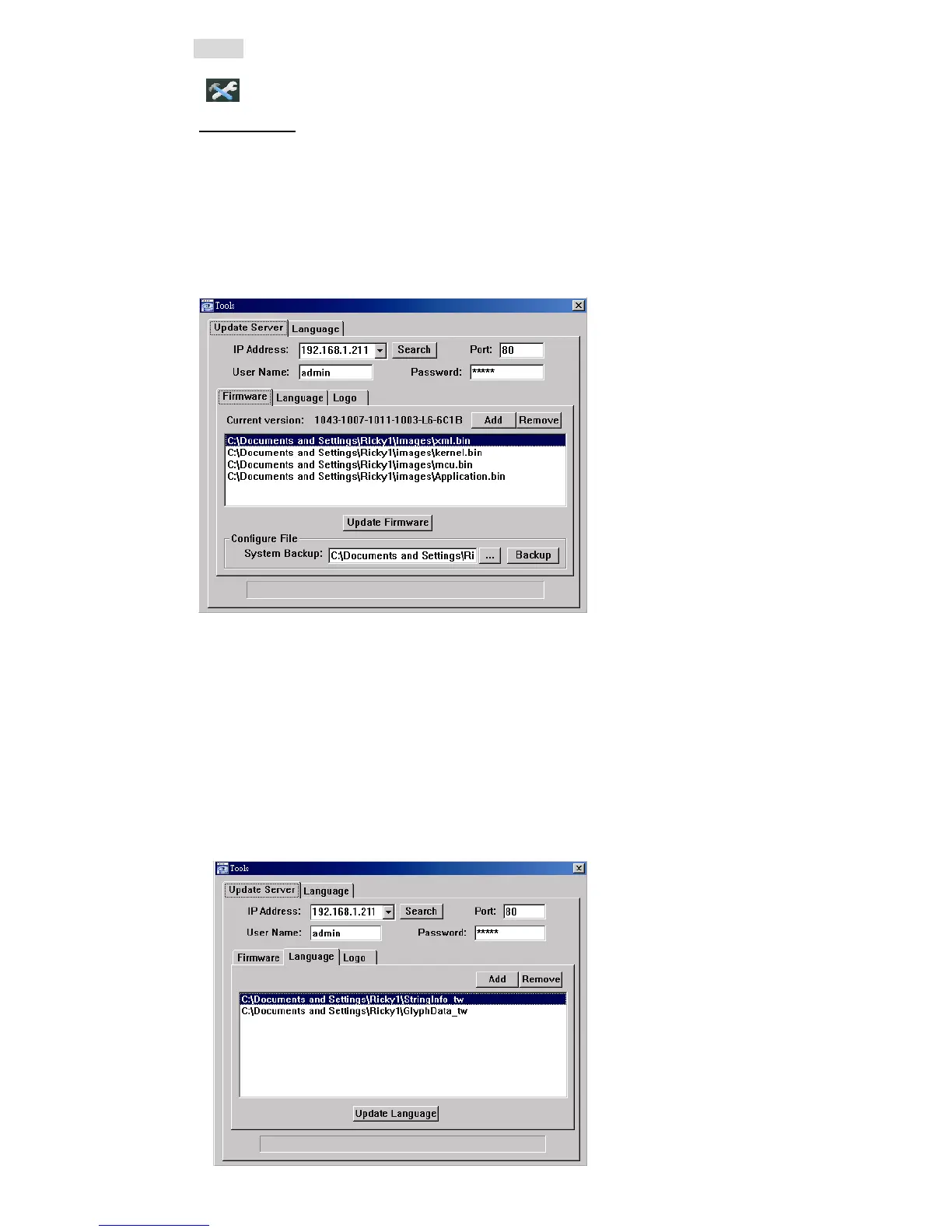 Click “ ” to upgrade the firmware version, multilingual OSD and boot display of your DVR (Update Server).
