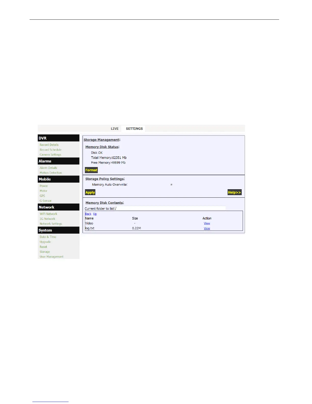 f) "Memory Disk Contents" will list all the folders and files on the storage media in chronological order. Clicking