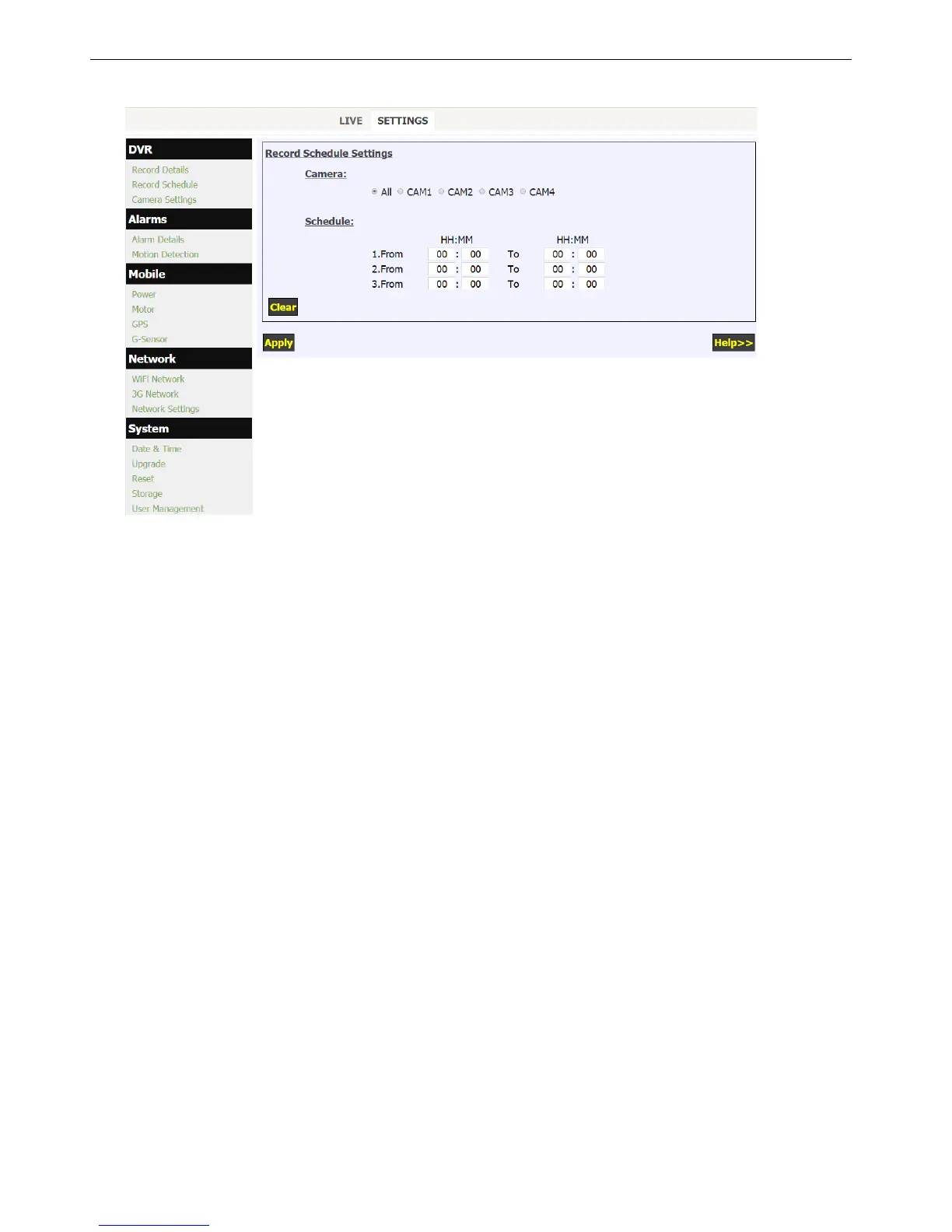2. Each camera can be scheduled individual, or click "All" to apply the same record schedule to all cameras.