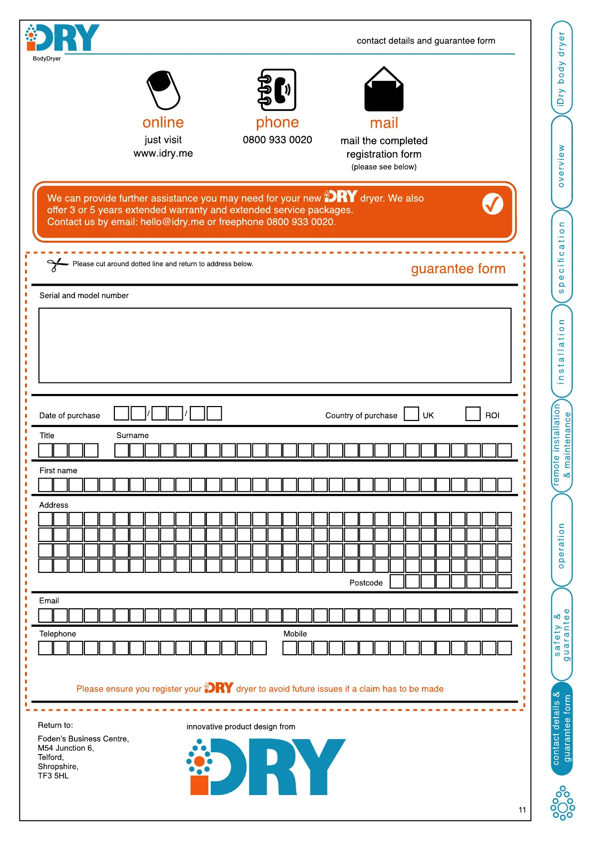 EasyCare iDry - Contact Details and Guarantee Form