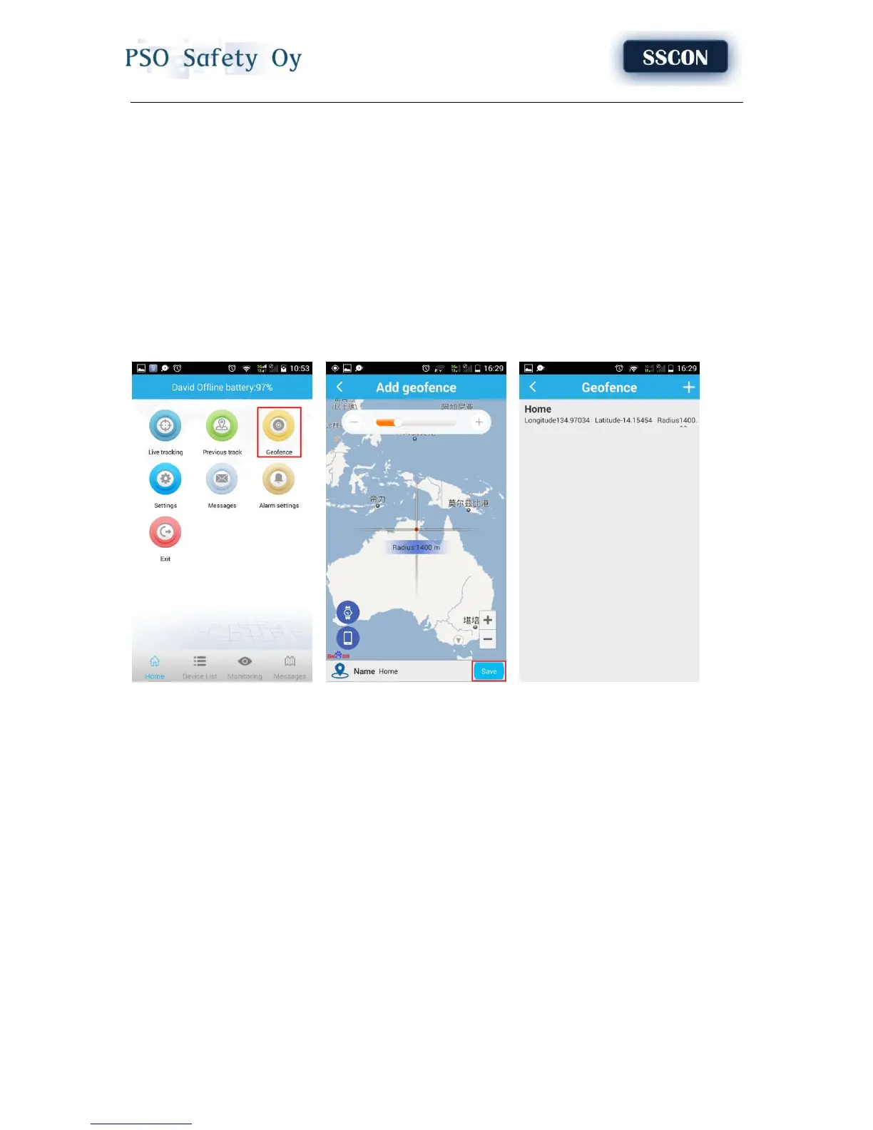 Click on the upper right corner “+”under main menu for setup geo-fence. Then the device will lock
