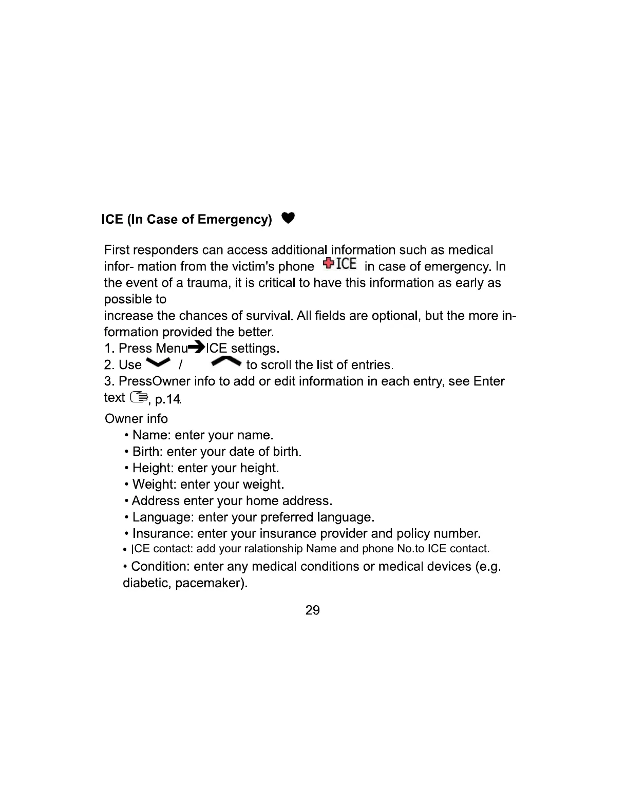 CE contact: add your ralationship Name and phone No.to ICE contact.