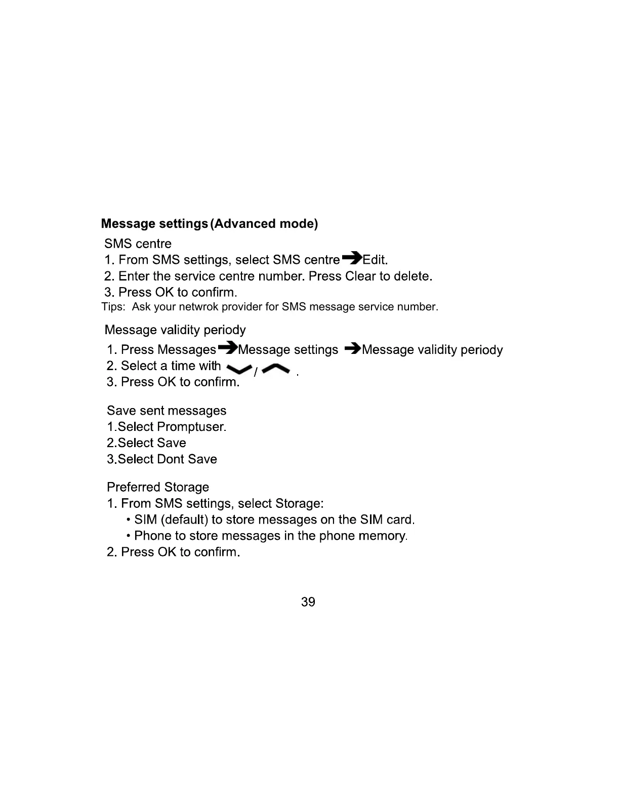 Easyfone Prime A1 - Message settings (Advanced mode); SMS centre; Message validity period; Save sent messages