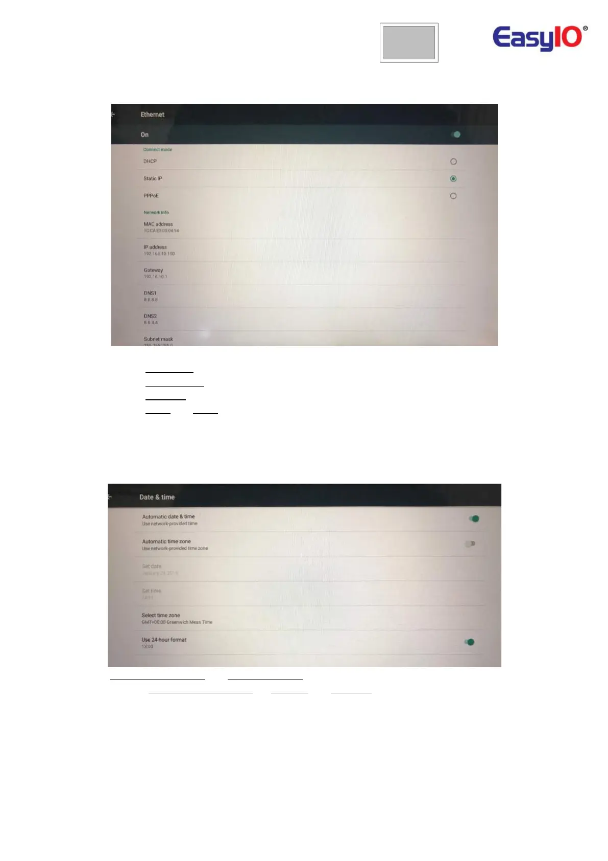 To connect the tablet to some device by Ethernet you need to configure the Ethernet network.