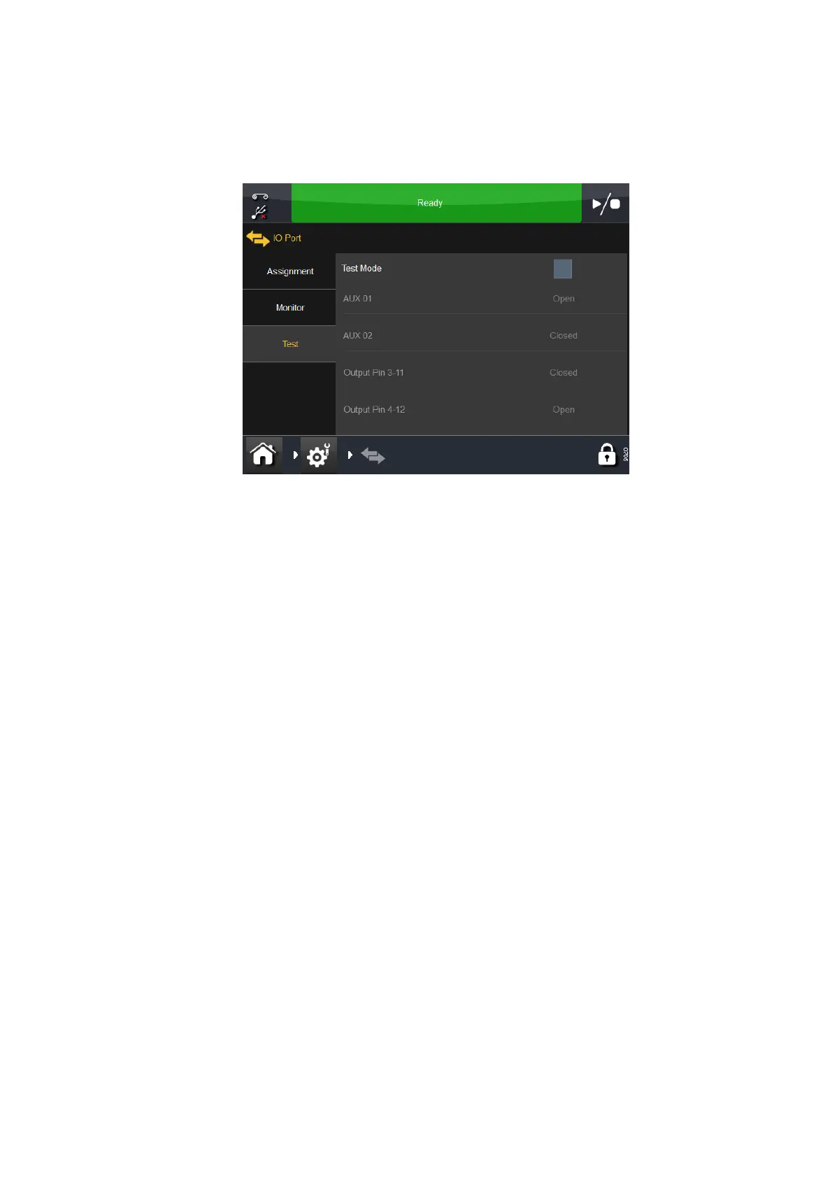 Select Settings > IO Port > Test. The following screen appears: