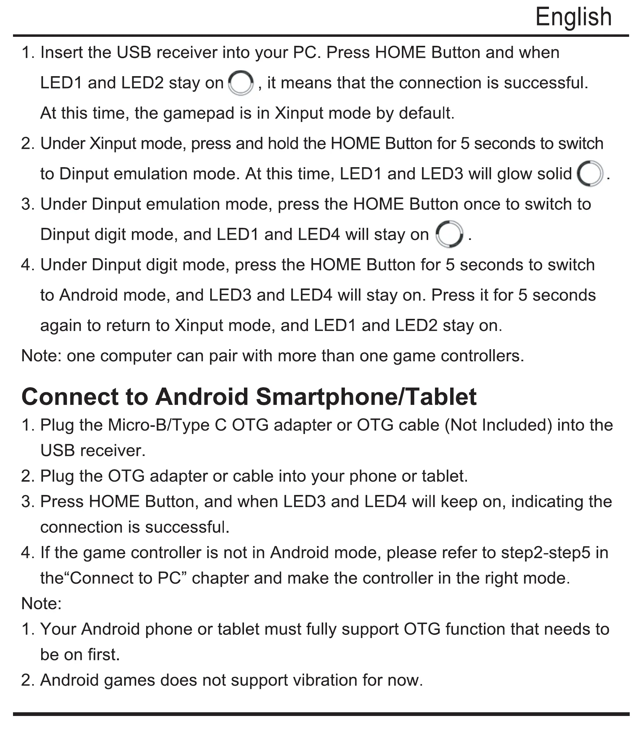 again to return to Xinput mode, and LEDI and LED2 stay on.