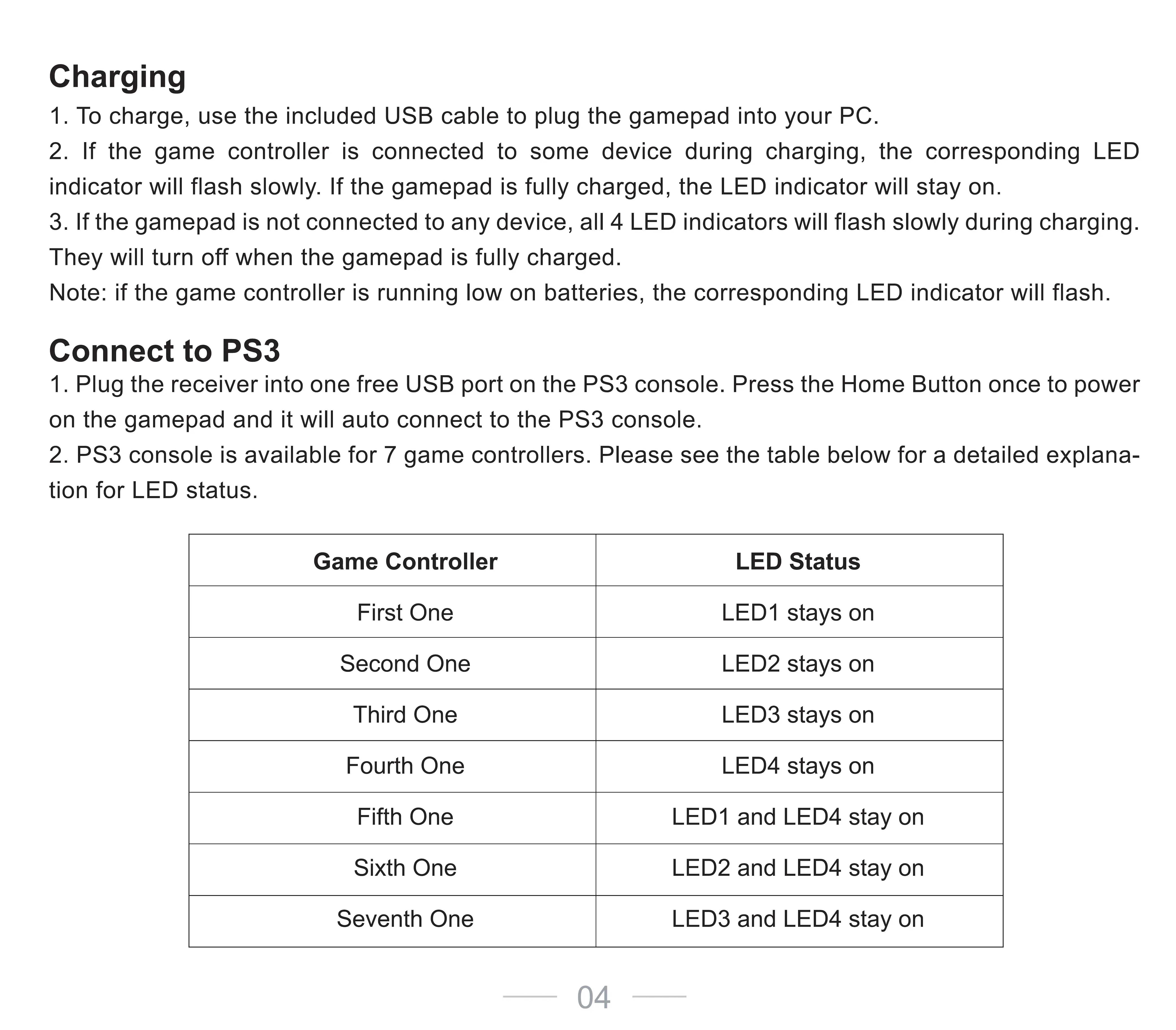 3. If the gamepad is not connected to any device, all 4 LED indicators will flash slowly during charging.