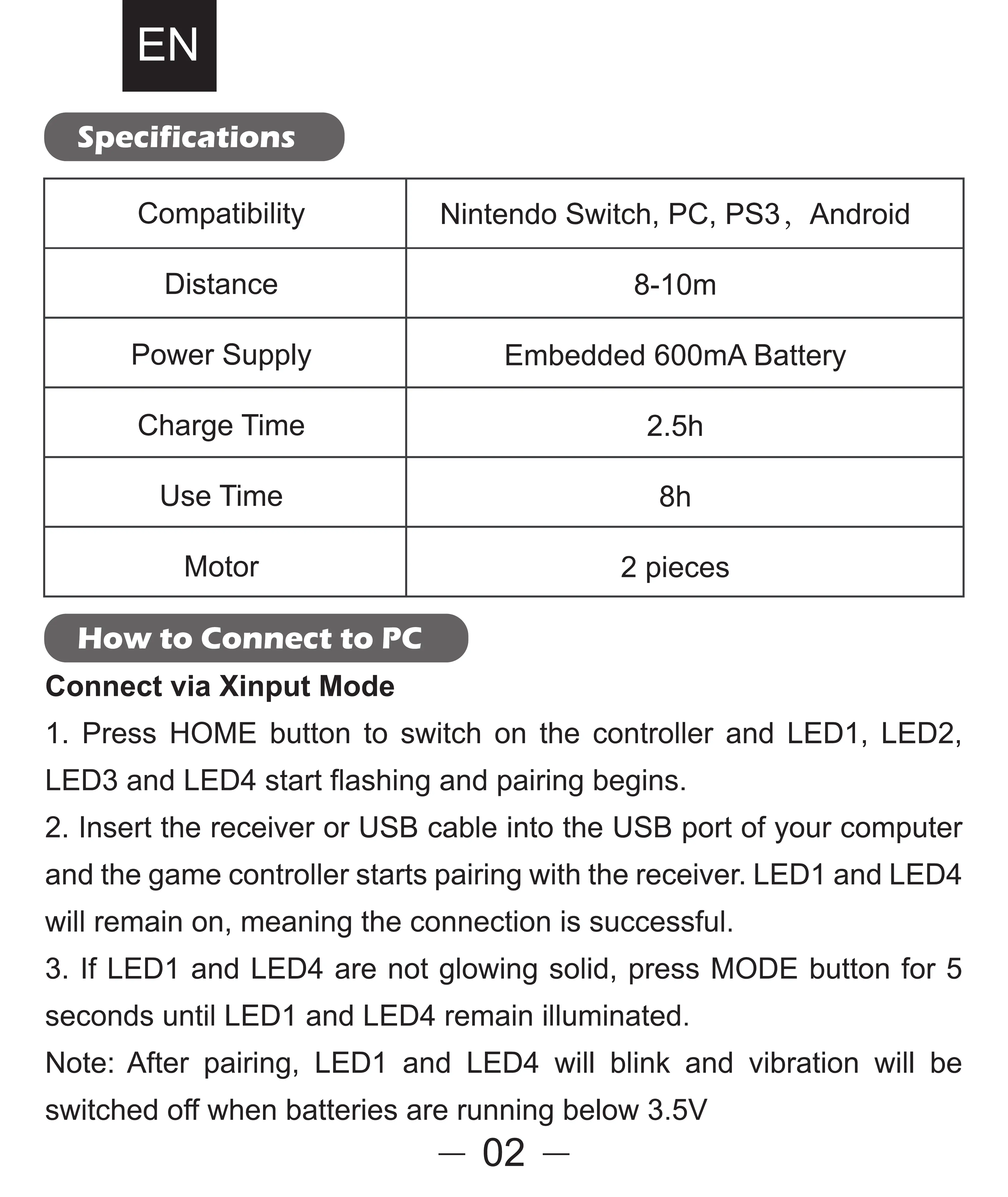and the game controller starts pairing with the receiver. LEDI and LED4