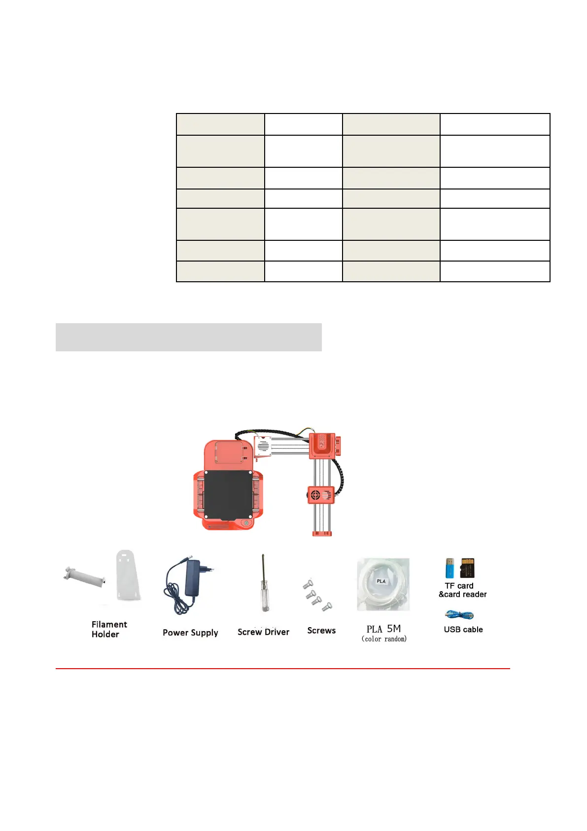 10M filament, power adaptor, TF card, card reader, screw driver. Filament holder, screw.