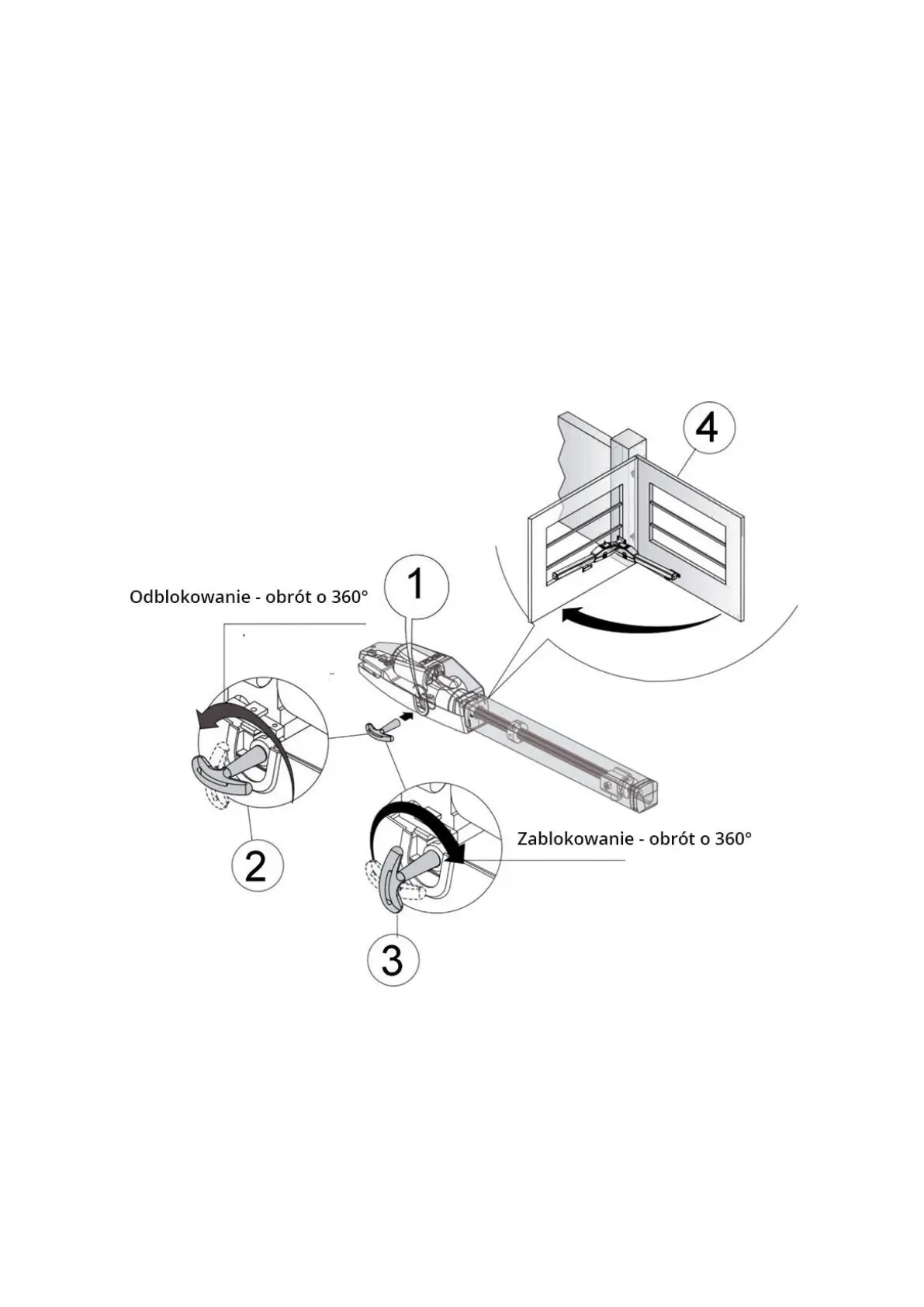 d) W celu ponownego zablokowania skrzydła należy włożyć klucz trójkątny (3) i przekręcić go o 360° w prawo.