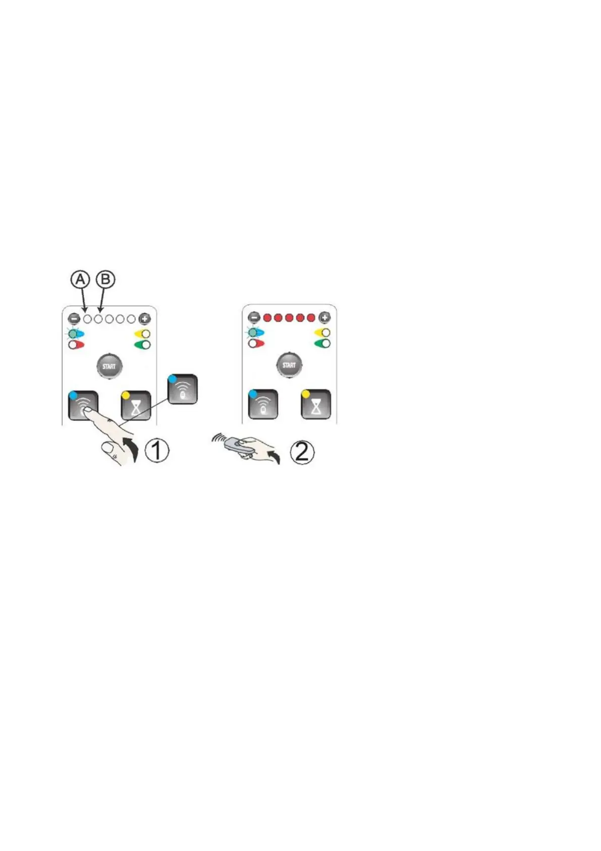 - Nacisnąć przycisk wyboru pilota (lewy górny przycisk). Lewa zielona dioda pod symbolem „-” oraz