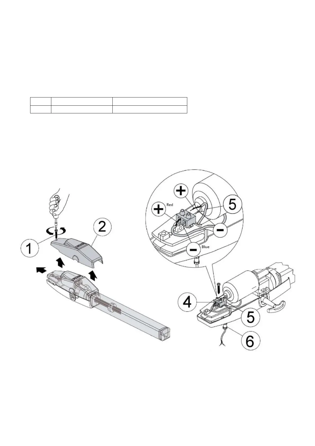 Attach the power cables (5) 2x1.5 mm2 to the plug (4). Remember that the red wire is “+” and the blue wire is