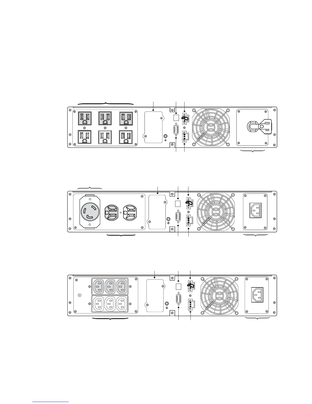 This section shows each model's rear panel. Receptacles in Load Segment 1 are shaded.