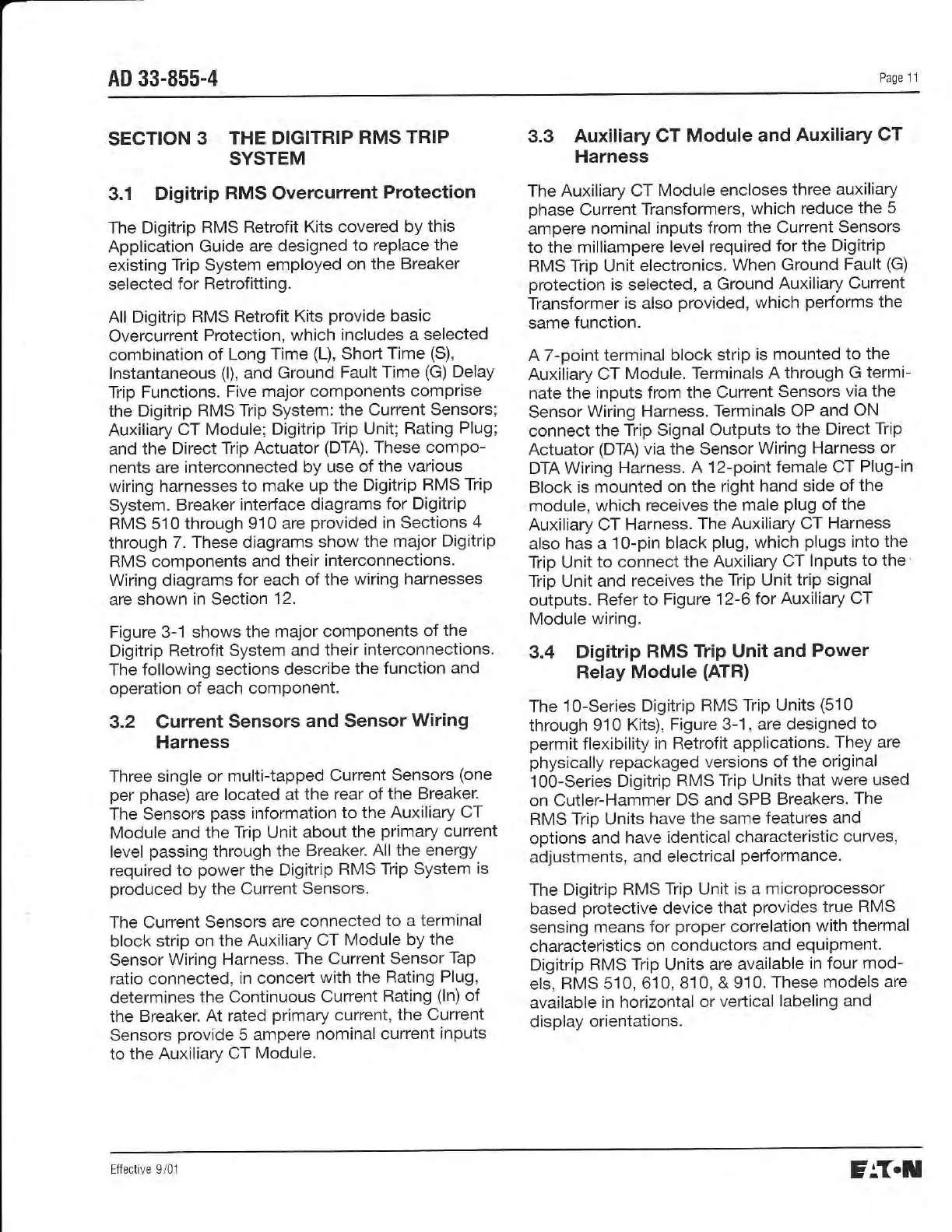 Eaton Cutler-Hammer Digitrip RMS 510 - Section 3 the Digitrip RMS Trip; Current Sensors and Sensor Wiring; Auxiliary CT Module and Auxiliary CT; Harness