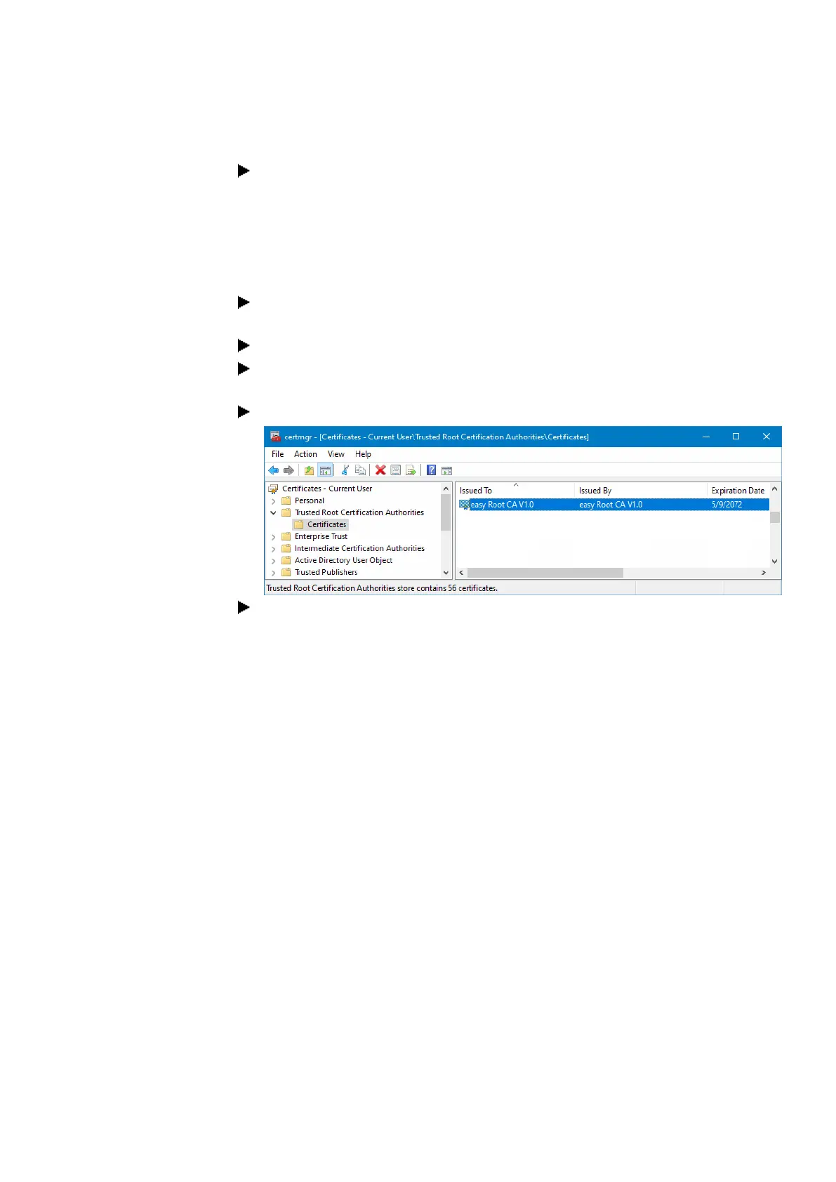 Open the Certificates – Current User / Trusted Root Certification Authorities /
