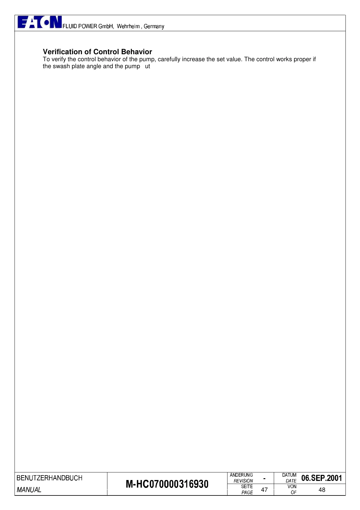 the swash plate angle and the pump outlet flow are also increased. If this is not the case please check
