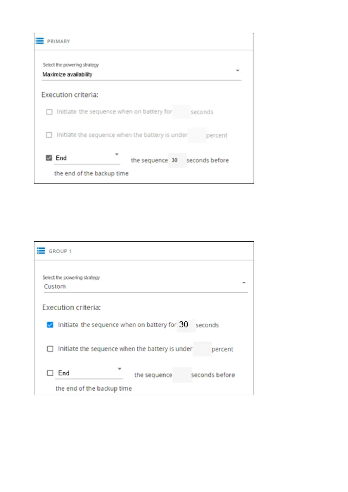 Applications must shutdown first so Group 1 has been set to start shutdown when on battery for 30s.